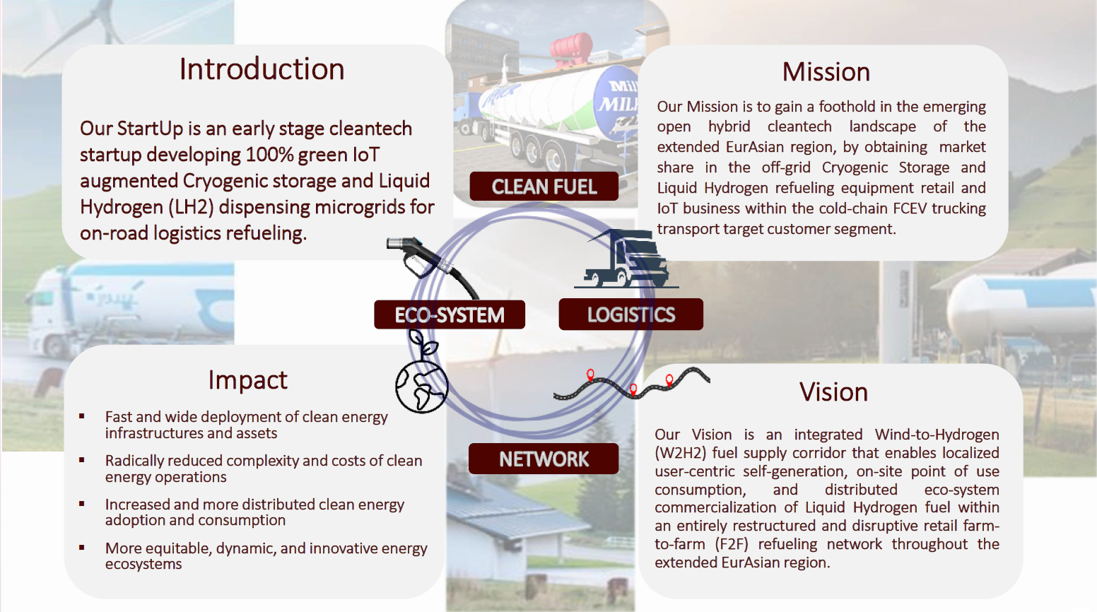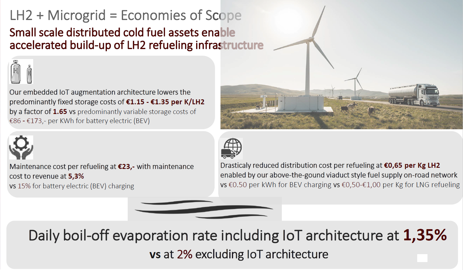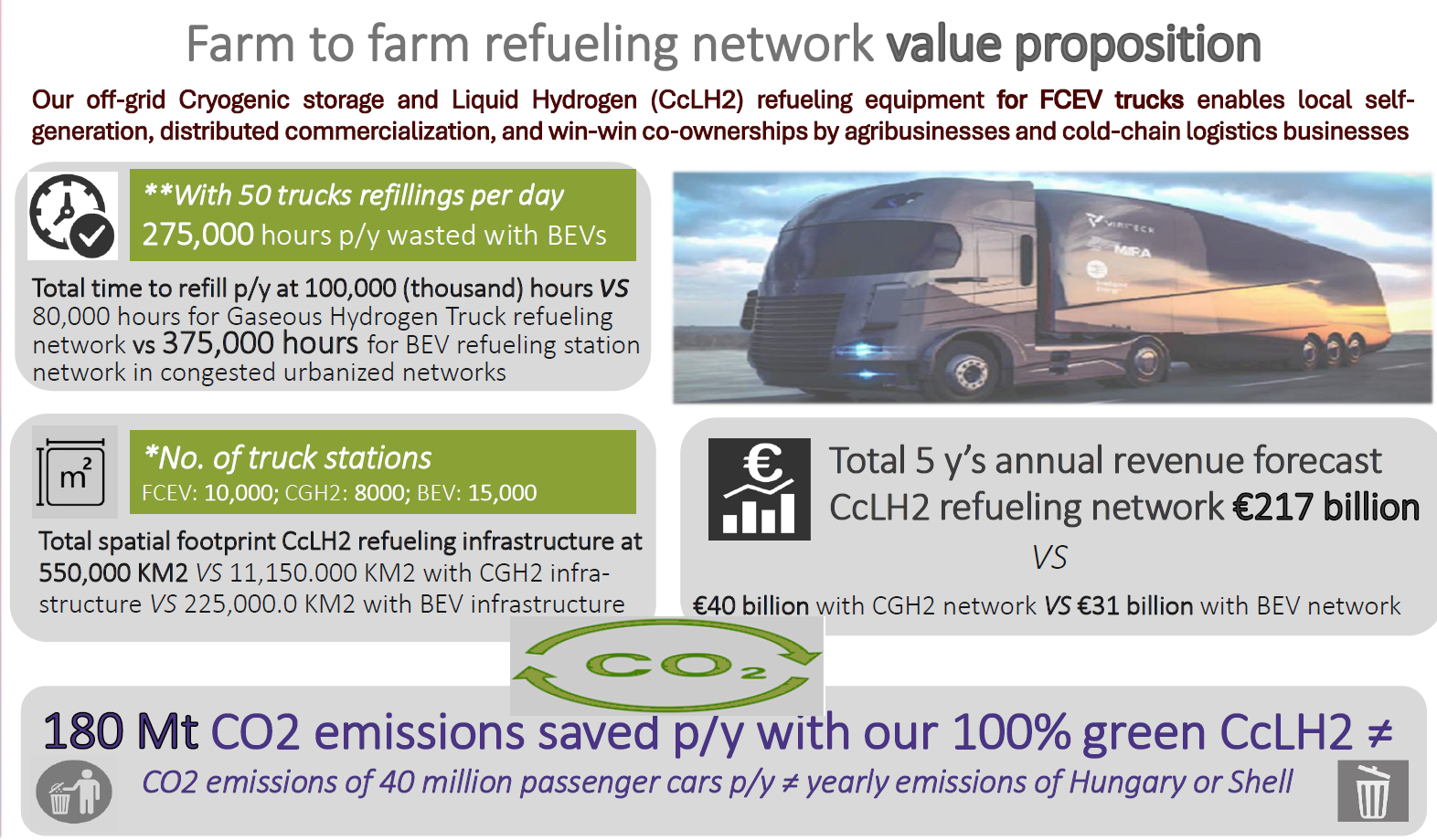 Our 100% green, distributed, IoT-embedded Liquid Hydrogen (LH2) refueling microgrids are the key enablers of accelerated deployment, local self-generation, and joint commercialization of small-scale Cryogenic Storage and Liquid Hydrogen refueling technology solutions for Hydrogen Trucks. Together with our agribusiness partners we are ensuring a seamlessly intelligent cold-chain logistics refueling experience alongside an entirely restructured retail refueling network throughout an extended EurAsian hydrogen market corridor from China to the Netherlands. As the top authority in cryogenic fluids we are redefining cold-fuel equipment tech infrastructures.